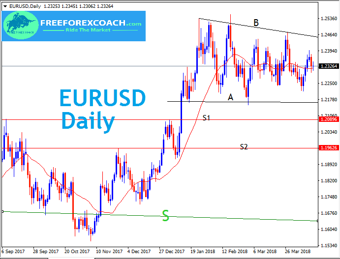 From the chart above, we see EURUSD price action as a channel congestion held by trendlines A and B. The green trendline is the monthly S trendline.