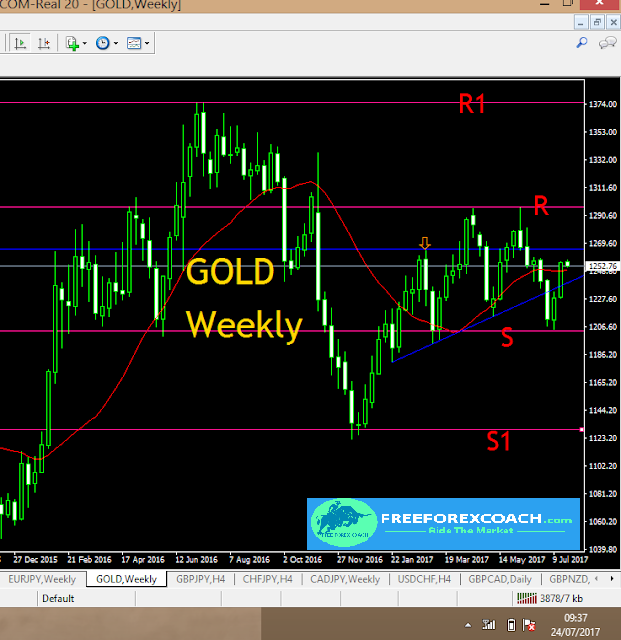 Currently the gold trader can see a clear congestion zone on the weekly chart, held by horizontal lines R and S.