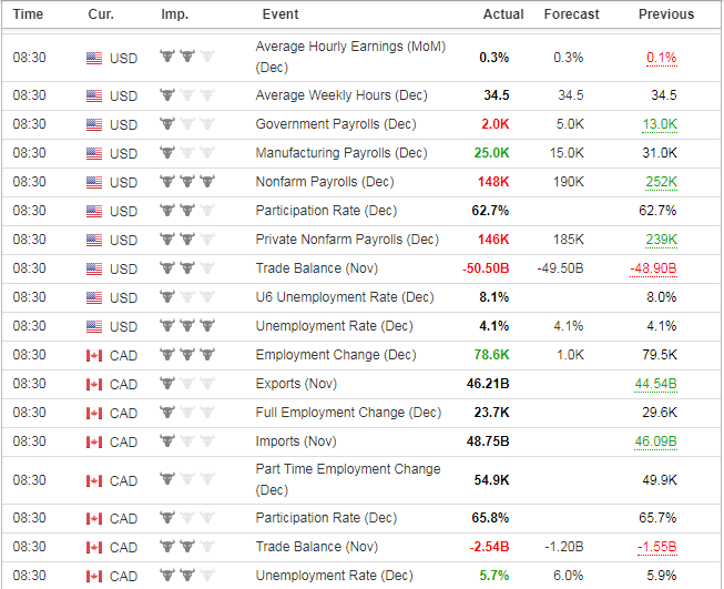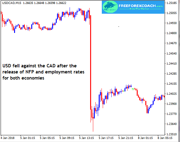The USD/CAD fell from 1.25121 to 1.23539 moving 158.2pips in just 15 minutes after Statistics Canada released the December jobs report.