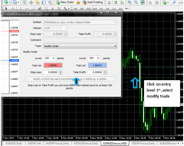 - Place your cursor at your entry point level , Right click and select the ‘Modify’ trade option.