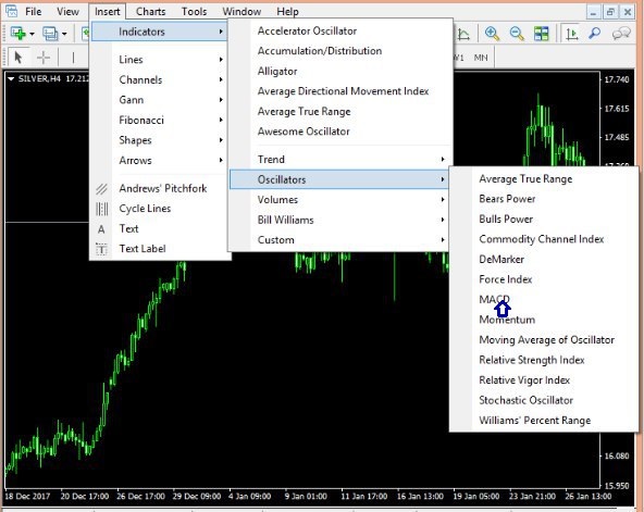 Simply go to ‘Insert’ > click open on MT4 platform and place your cursor on indicators.