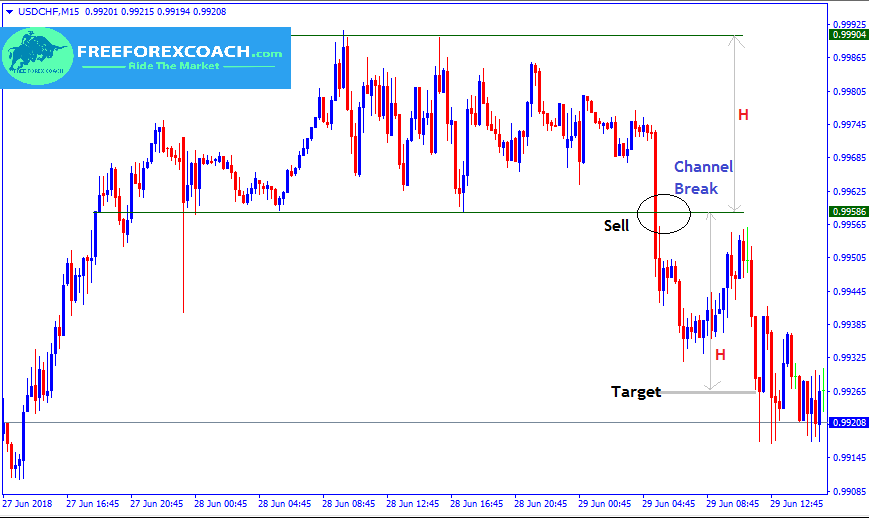 The profit target is got by measuring height (H) of the channel and projecting same distance to the downside.