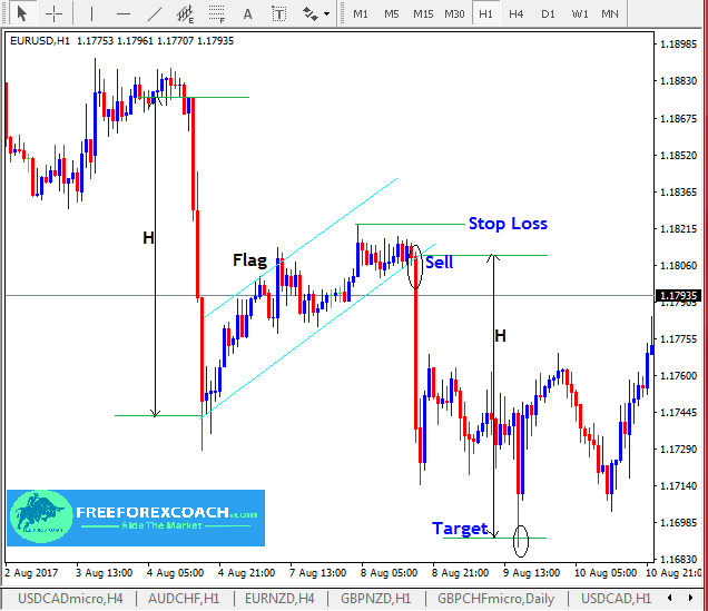 The profit target is equal to the distance moved by price before the formation of the flag (H) or the flag pole.