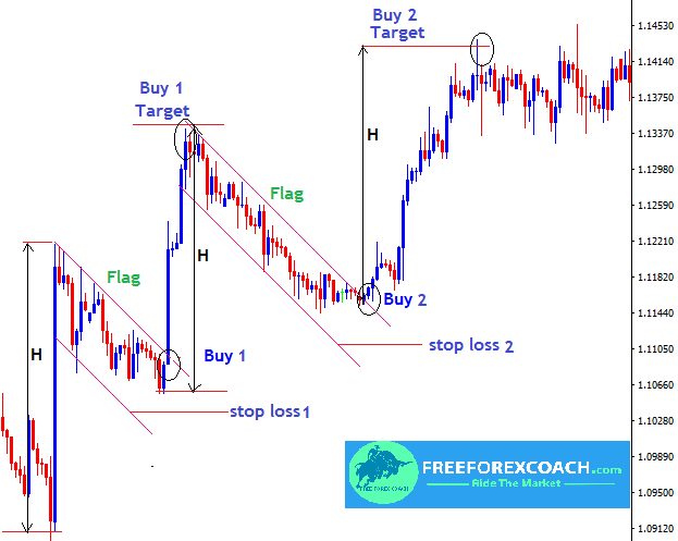 To set your target profit, measure the distance moved by price before formation of the flag or the flag pole.