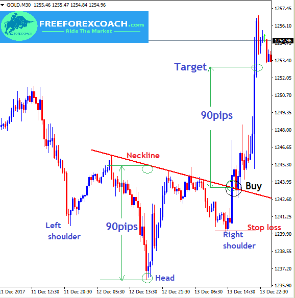 Our target profit is got by measuring vertical distance (90 pips) from Head to Neckline and projecting that same distance (90 pips) upwards.
