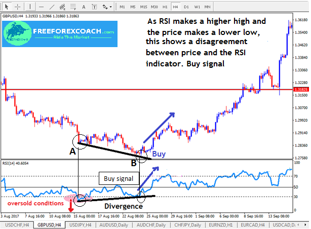 From the chart above, note that the price at A and RSI all had clear lows, when price hit a new low at B, the RSI formed a high. This is a bullish divergence and indicates an uptrend trend hence a buy signal.