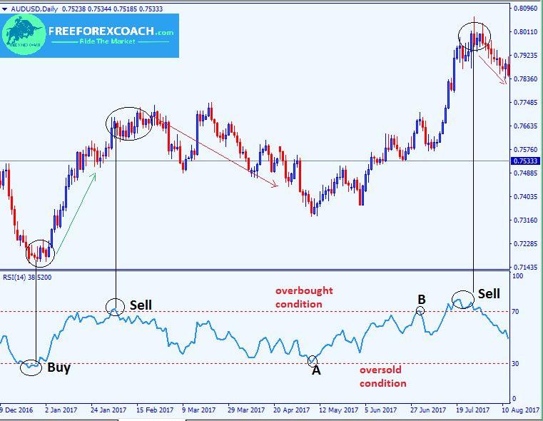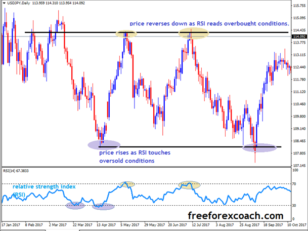 This commonly applies very well while trading ranging markets. As prices bounces off support and resistance levels in a range, watch RSI for overbought and oversold conditions.