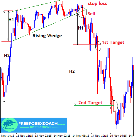 Take profit target 1 is equal to the size of the wedge (H1) and Profit target 2 is equal to the distance moved by price before formation (H2) of the pattern.