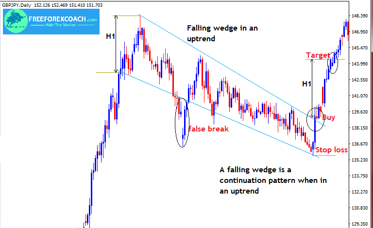 - Take profit target 1 is equal to the size of the wedge (H1).