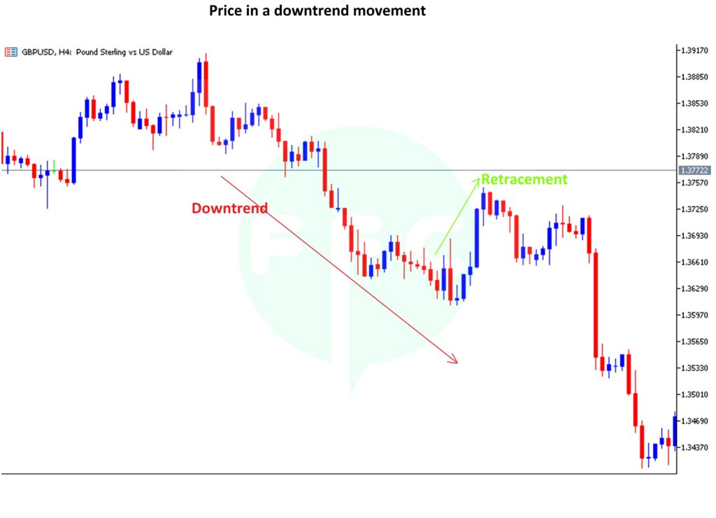 On contrary, when price is trending down, then suddenly moves up shortly and later continues in its initial direction, it’s a retracement.