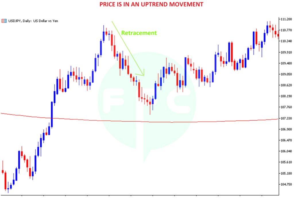 For an uptrend, a retracement occurs when price is moving up, then pulls back down for a short time and later continues in its initial direction. That pullback to the downside is a retracement.