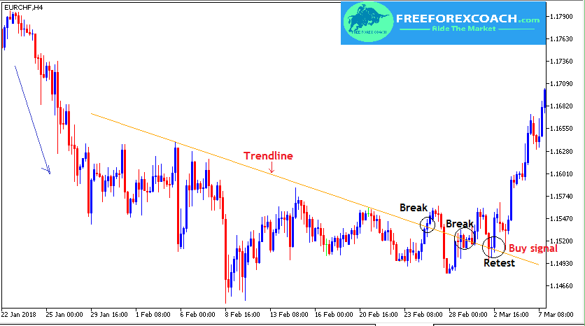 The buy signal confirmation is a the candle close above resistance level.