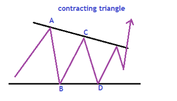 The triangle corrections move in a side ways movement with decreasing volumes and volatility. The correction has five waves and each subdivide into 3 waves.