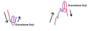 A gravestone doji candlestick pattern after a long up trend above, shows that the buyers are getting weak and the appearance of sellers is shaking the market.