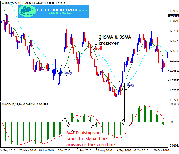 We can clearly see the MACD histogram and signal line crossovers with the zero line corresponding with the moving averages crossovers.