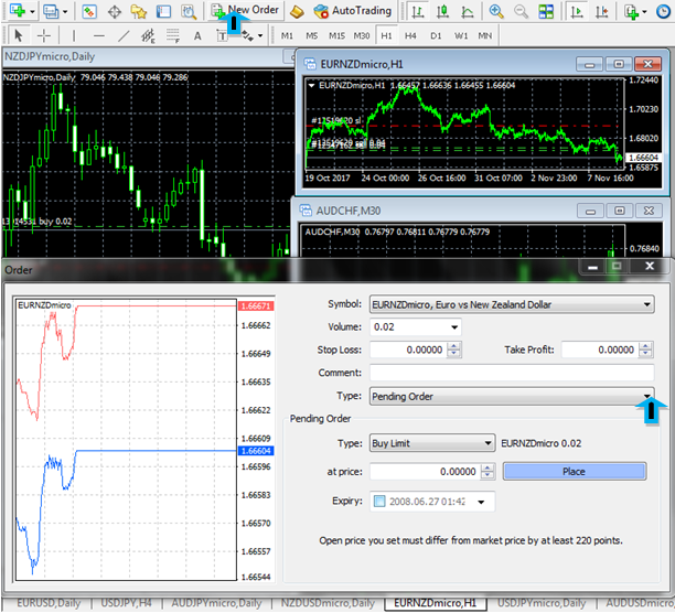 - On pending order Type, determine whether you want a buy limit or sell limit order, buy stop or sell stop.