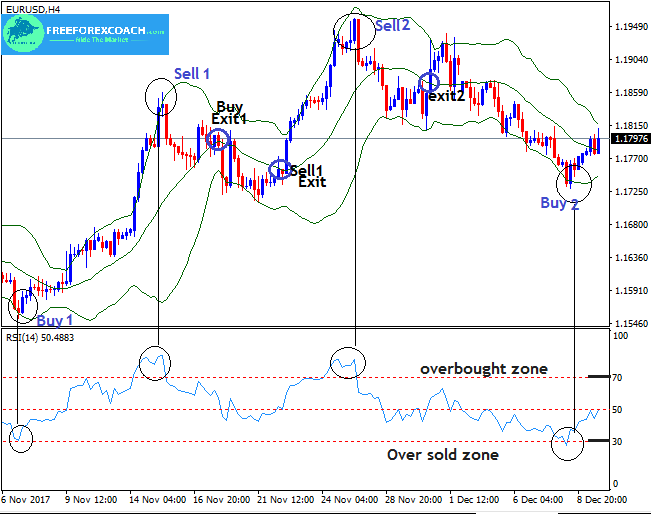So the entry signals are when the RSI shows overbought or oversold market conditions as price moves on the Upper or the lower band respectively.