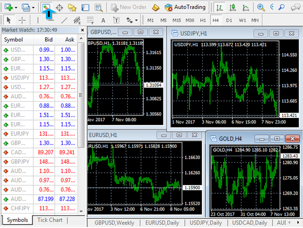 Or else you can use (Ctrl+M) to access the market watch. On the list of currency pairs, choose any pair you would like to trade.