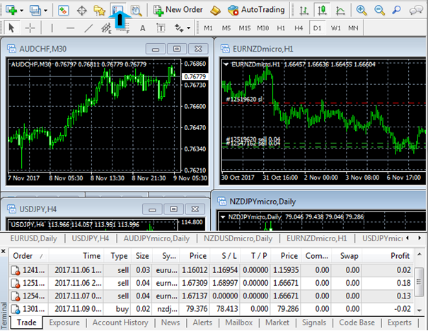 To access the terminal, use ( ctrl+T) to display it or click on the terminal box on the tool bar of the market chart as shown below.