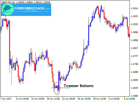 The Tweezers bottoms appears at the end of an extended downtrend. Therefore, they are bullish reversal patterns. They have real bodies, shadows or a doji and must have the same lows/bottoms.