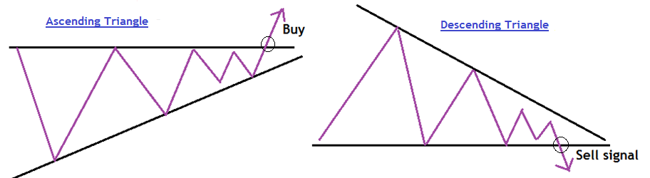 The triangle corrections move in a side ways movement with decreasing volumes and volatility. The correction has five waves and each subdivide into 3 waves.